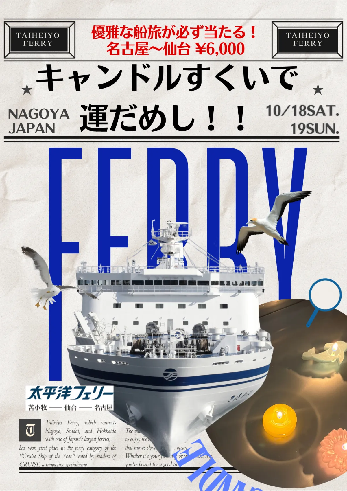 今回は、2025年10月18日と19日に名古屋市で開催される「第71回 名古屋まつり」で、太平洋フェリーがお届けする新企画「キャンドルすくいで運だめし!!」についてご紹介します。この企画は昨年の大好評を受け、今年も登場。参加することで、名古屋から仙台間の優待乗船券が確実に手に入るチャンスをお見逃しなく!