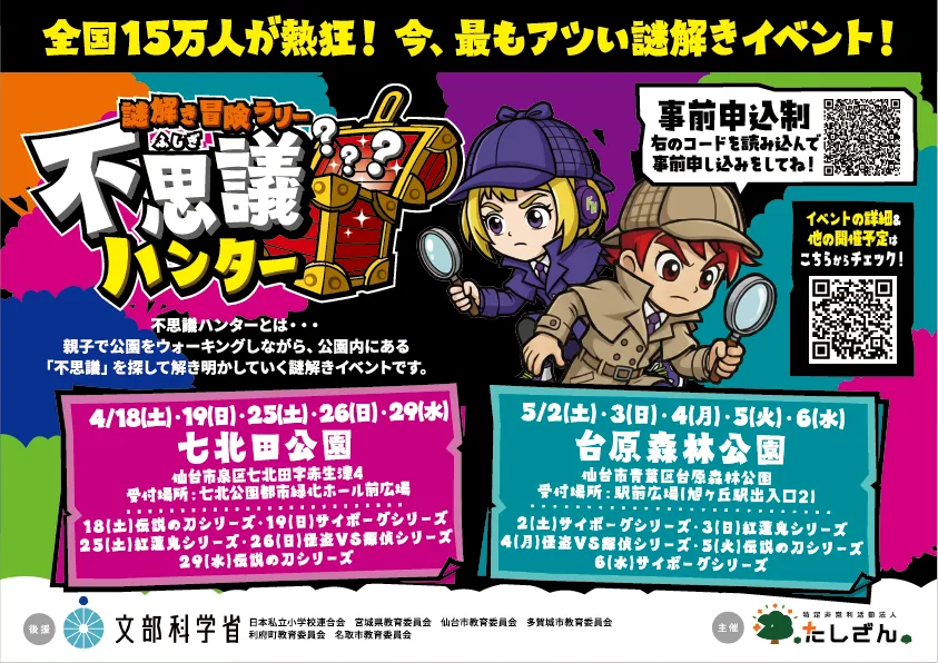 このイベントでは、各地の教育委員会の後援を受け、全国各地の公園で春と秋の2回行われています。仙台市内の公園に設置された色々な謎を解き明かしながら、公園内を歩き回る形式です。また、毎回異なるシリーズの物語が用意されており、参加者は新たな挑戦を楽しむことができます。