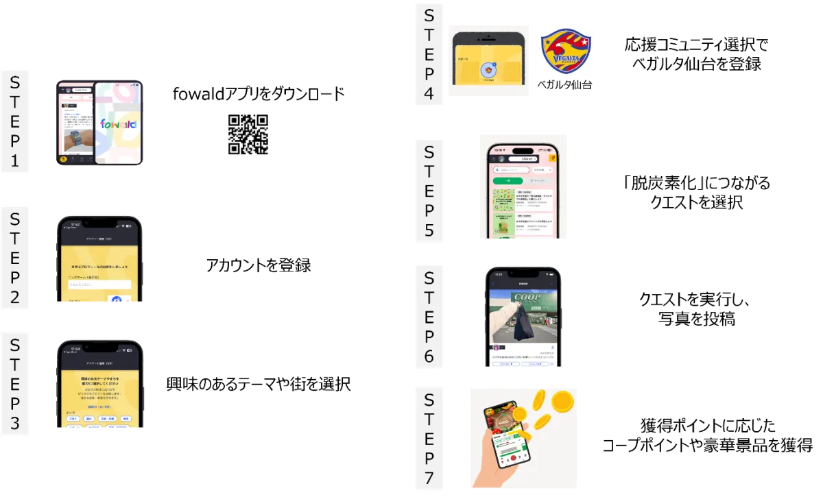 「杜の都脱炭素デイリーアクション」は、毎日の生活の中で簡単にできる脱炭素行動を促進するためのアプリ「fowald」を利用します。このアプリでは、日常の中で取り組むべき環境配慮行動をお題として出題し、市民がそれを実践することで、写真を投稿できます。実践した市民にはインセンティブが提供され、さらなる参加を促す仕組みが整えられています。