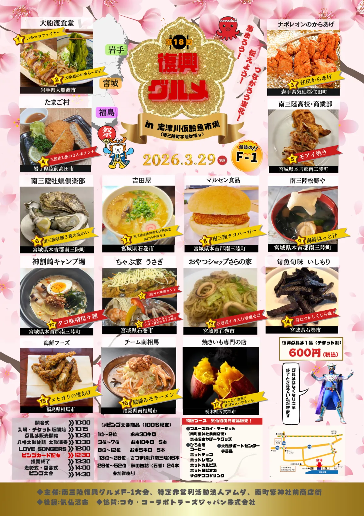 この素晴らしいイベントは、南三陸復興グルメF-1大会、および特定非営利活動法人アムダが主催しており、南町紫神社前商店街が後援しています。また、気仙沼市が協賛およびサポートを行っています。